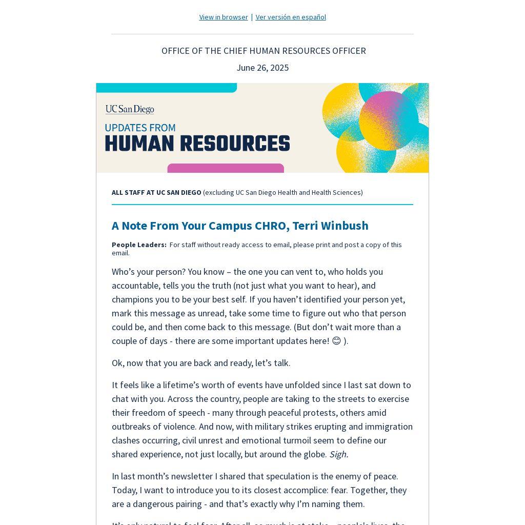 People Leaders on campus, join us on Thursday, July 10, 2025, from 1:30 – 3 p.m. for a two-part webinar series exploring Change, Community, and Agency - a focused conversation for employees navigating ongoing uncertainty in the workplace. In part one, we’ll unpack how to foster a sense of stability and cohesion amid disruption. Part two will shift the focus inward, offering strategies for career growth, upskilling, and reclaiming agency in the face of evolving professional demands. Together, we’ll explore how to lead with resilience, support others through transformation, and build strength in the midst of change. Register for session one on Zoom.