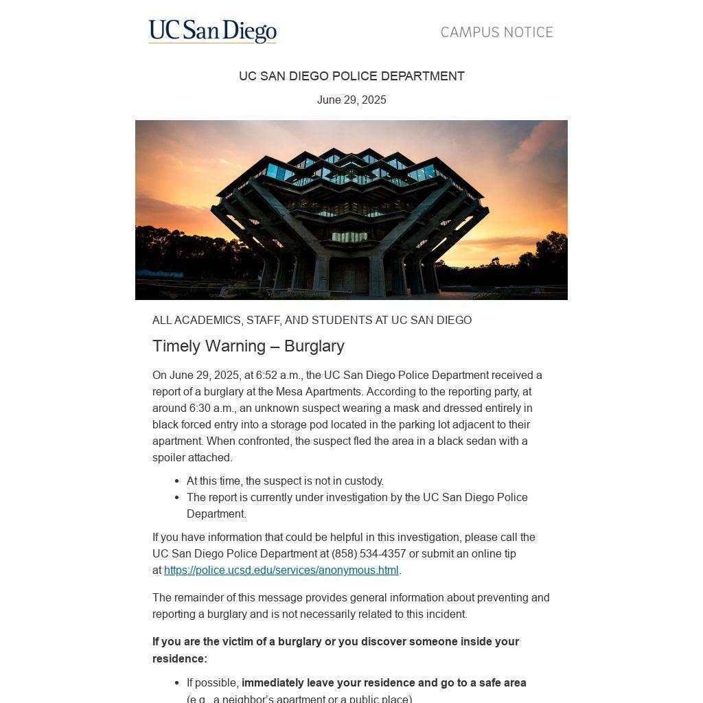 On June 29, 2025, at 6:52 a.m., the UC San Diego Police Department received a report of a burglary at the Mesa Apartments. According to the reporting party, at around 6:30 a.m., an unknown suspect wearing a mask and dressed entirely in black forced entry into a storage pod located in the parking lot adjacent to their apartment. When confronted, the suspect fled the area in a black sedan with a spoiler attached.