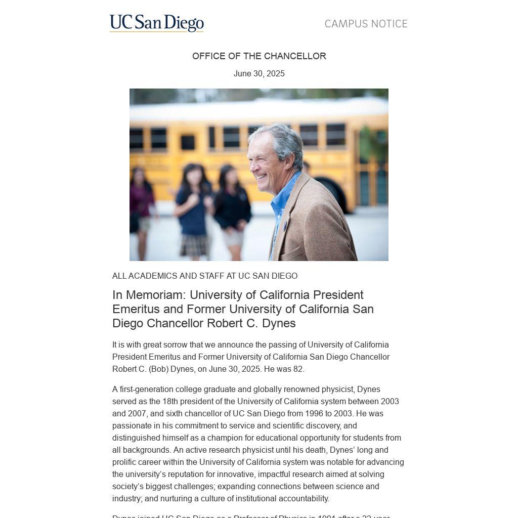 It is with great sorrow that we announce the passing of University of California President Emeritus and Former University of California San Diego Chancellor Robert C. (Bob) Dynes, on June 30, 2025. He was 82.