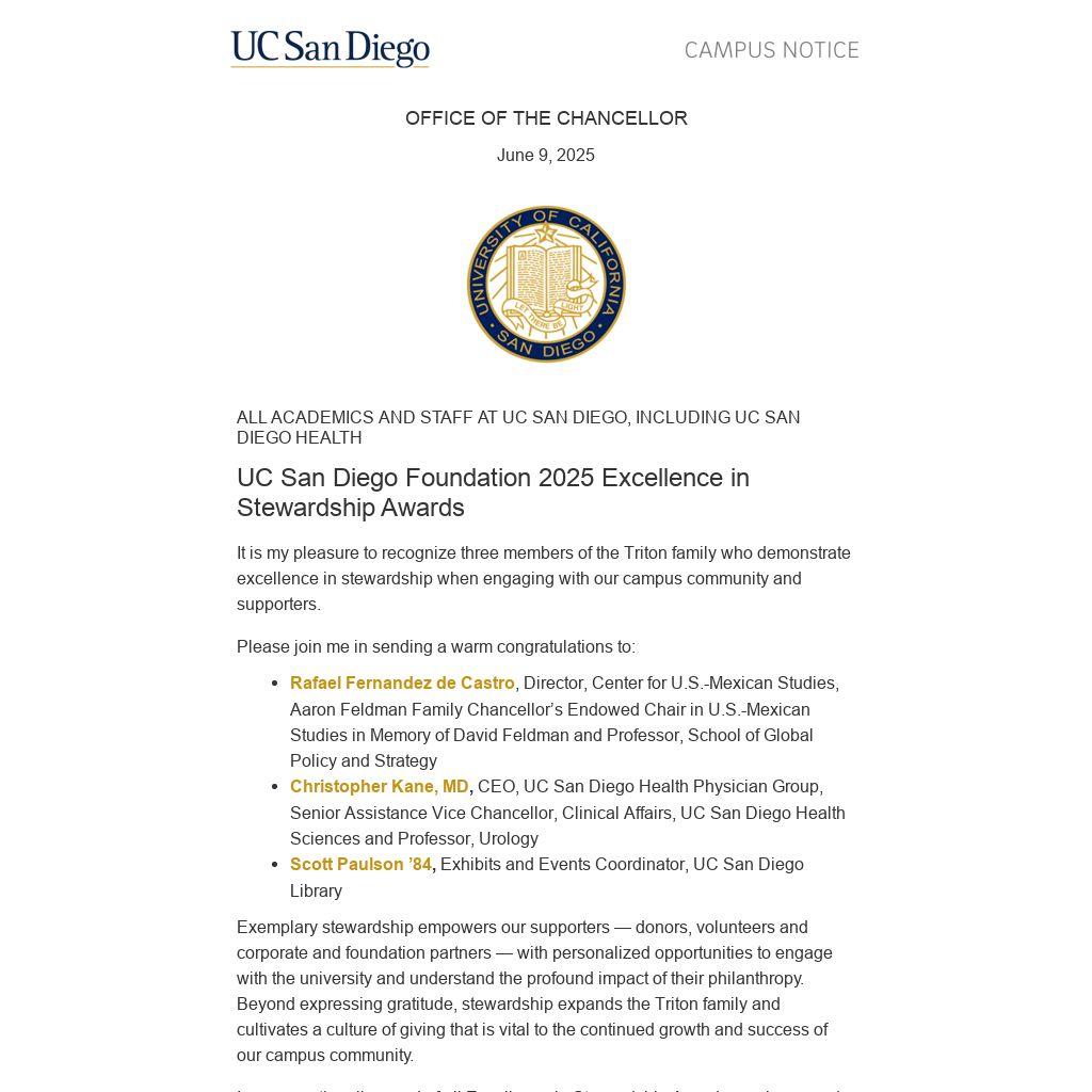 Recognition is a meaningful endorsement of your colleagues’ work and passion, and I encourage you to consider who you might nominate for the 2026 Excellence in Stewardship Awards. For additional information, please contact Taylor Thomas at t2thomas@ucsd.edu.