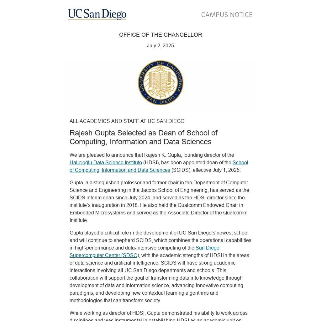 We invite the campus community to join us in congratulating Rajesh Gupta on his permanent appointment to this important role.