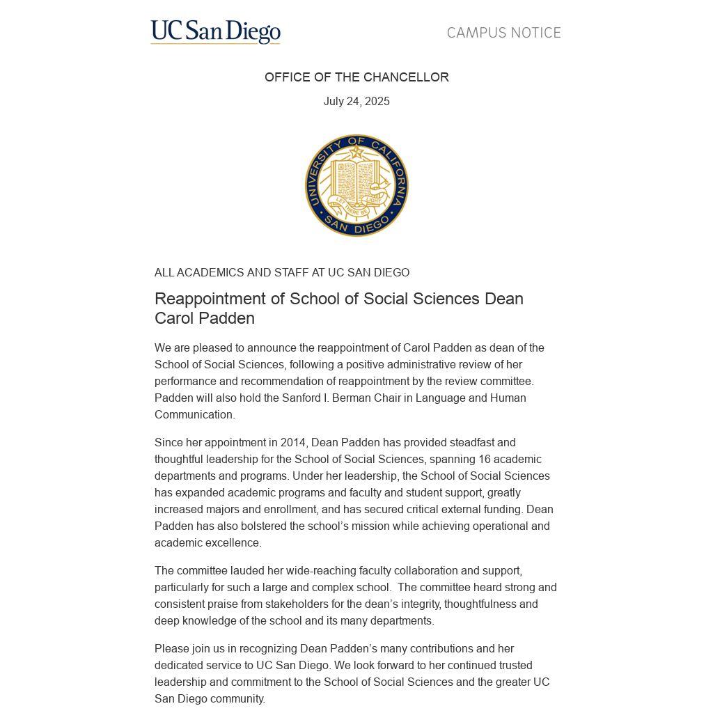 Please join us in recognizing Dean Padden’s many contributions and her dedicated service to UC San Diego. We look forward to her continued trusted leadership and commitment to the School of Social Sciences and the greater UC San Diego community.
