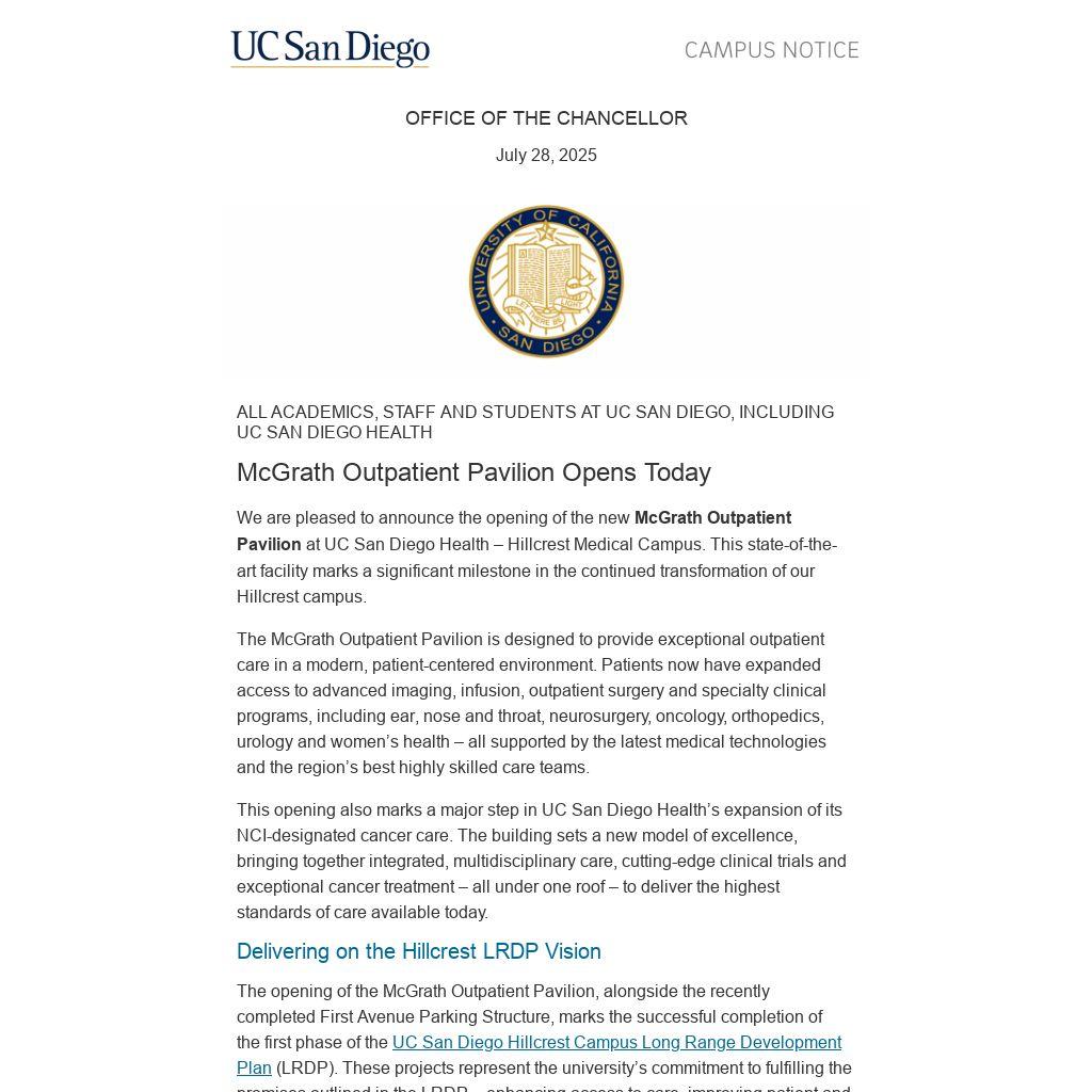We are pleased to announce the opening of the new McGrath Outpatient Pavilion at UC San Diego Health – Hillcrest Medical Campus. This state-of-the-art facility marks a significant milestone in the continued transformation of our Hillcrest campus.