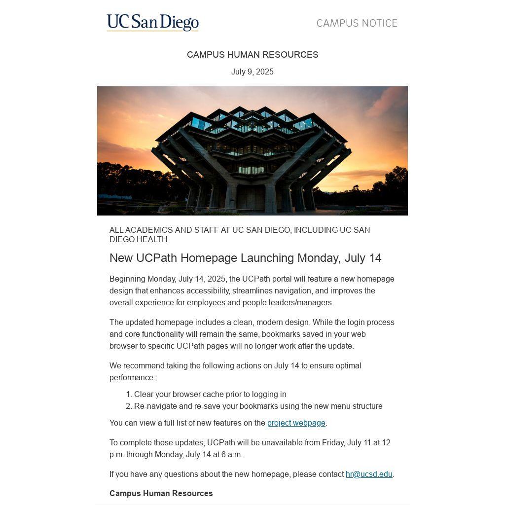 Beginning Monday, July 14, 2025, the UCPath portal will feature a new homepage design that enhances accessibility, streamlines navigation, and improves the overall experience for employees and people leaders/managers.