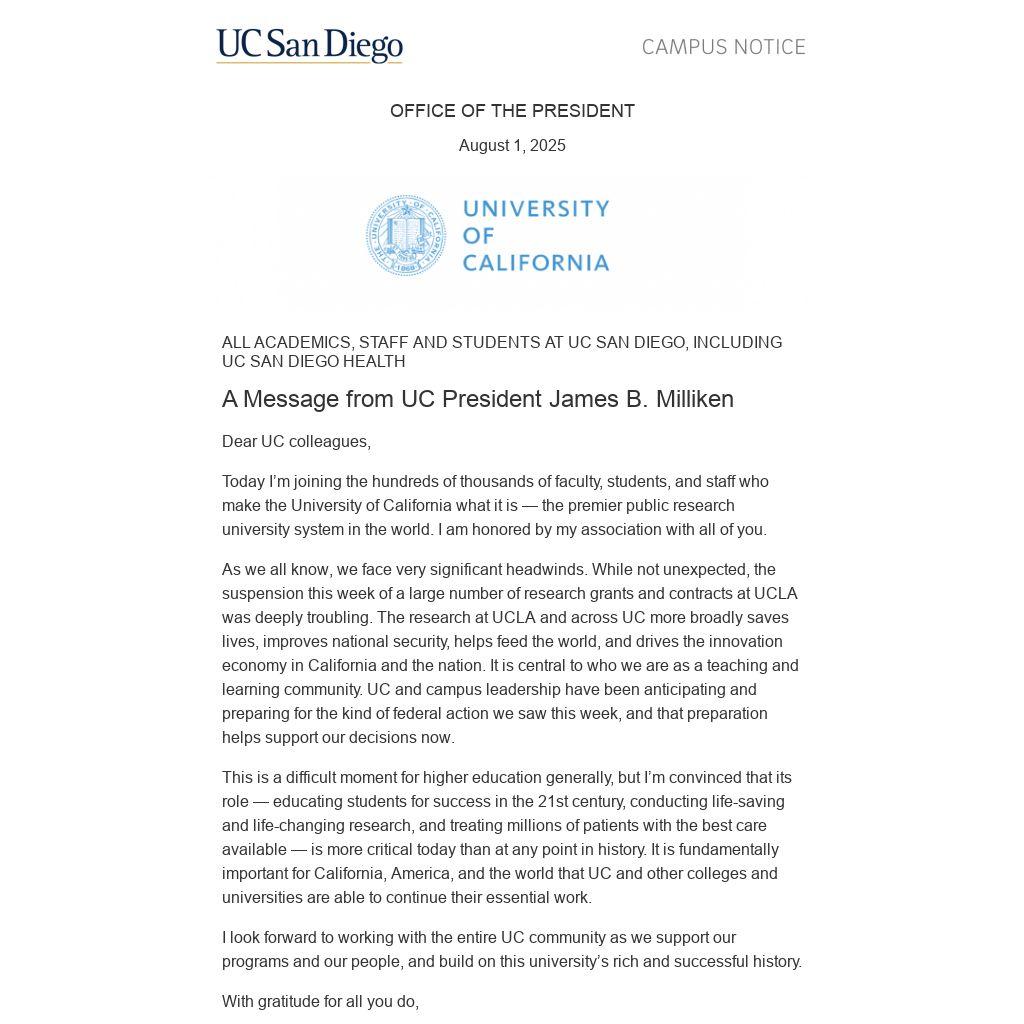 As we all know, we face very significant headwinds. While not unexpected, the suspension this week of a large number of research grants and contracts at UCLA was deeply troubling. The research at UCLA and across UC more broadly saves lives, improves national security, helps feed the world, and drives the innovation economy in California and the nation. It is central to who we are as a teaching and learning community. UC and campus leadership have been anticipating and preparing for the kind of federal action we saw this week, and that preparation helps support our decisions now.