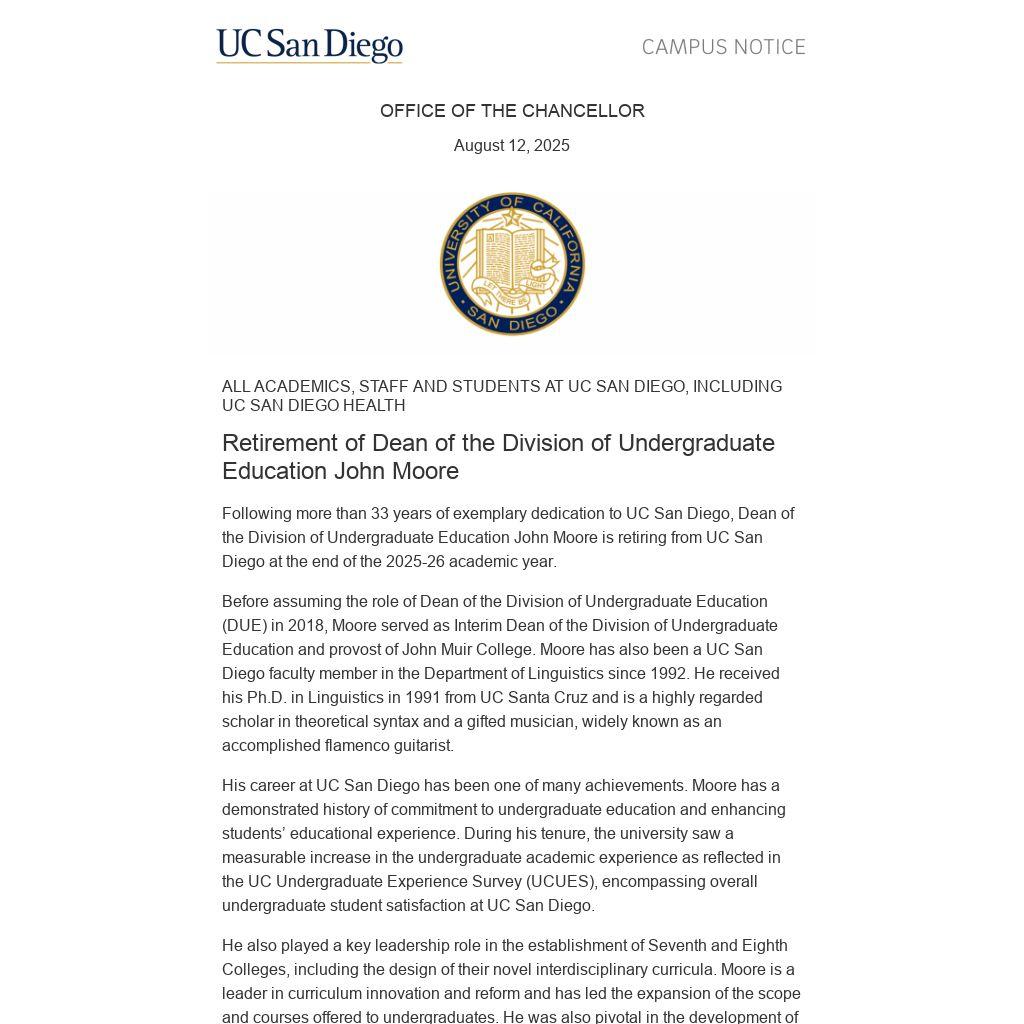 Following more than 33 years of exemplary dedication to UC San Diego, Dean of the Division of Undergraduate Education John Moore is retiring from UC San Diego at the end of the 2025-26 academic year.