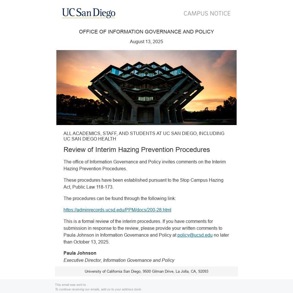 This is a formal review of the interim procedures. If you have comments for submission in response to the review, please provide your written comments to Paula Johnson in Information Governance and Policy at policy@ucsd.edu no later than October 13, 2025.