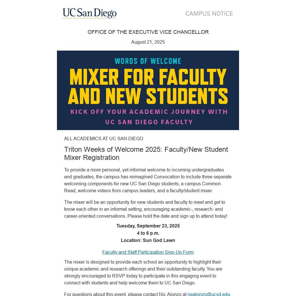 To provide a more personal, yet informal welcome to incoming undergraduates and graduates, the campus has reimagined Convocation to include three separate welcoming components for new UC San Diego students; a campus Common Read, welcome videos from campus leaders, and a faculty/student mixer.