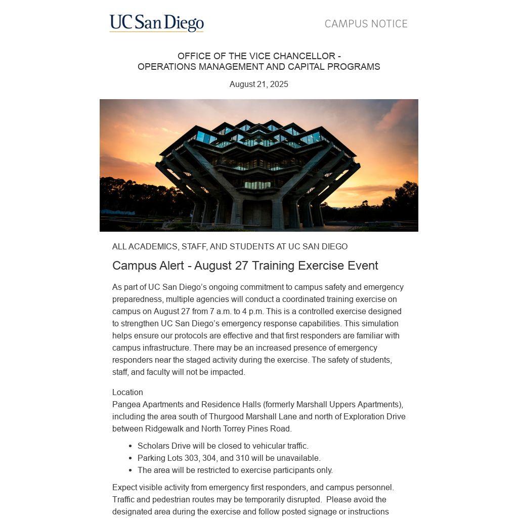 As part of UC San Diego’s ongoing commitment to campus safety and emergency preparedness, multiple agencies will conduct a coordinated training exercise on campus on August 27 from 7 a.m. to 4 p.m. This is a controlled exercise designed to strengthen UC San Diego’s emergency response capabilities. This simulation helps ensure our protocols are effective and that first responders are familiar with campus infrastructure. There may be an increased presence of emergency responders near the staged activity during the exercise. The safety of students, staff, and faculty will not be impacted.