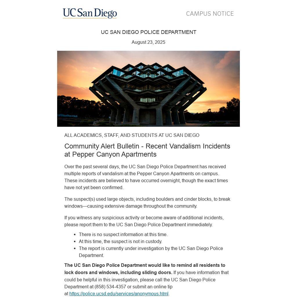 Community Alert Bulletin - Recent Vandalism Incidents at Pepper Canyon Apartments |