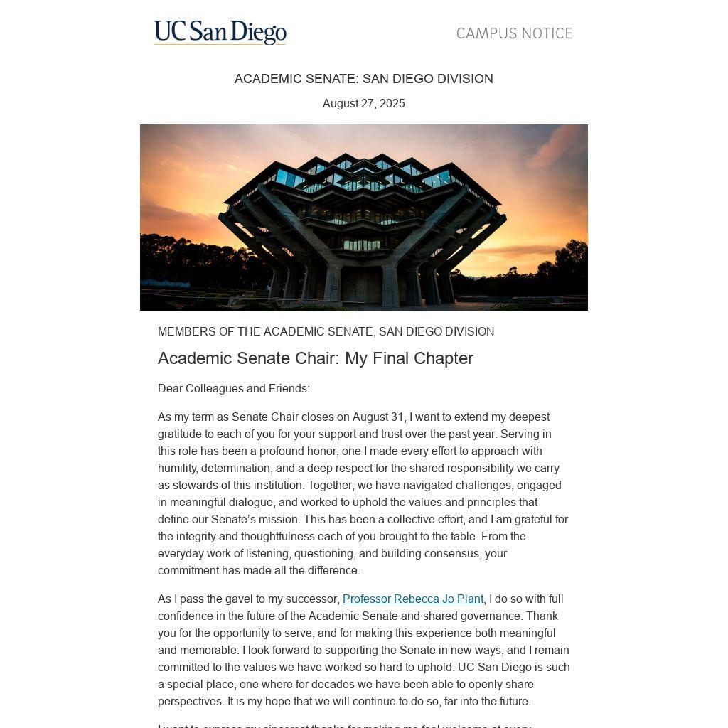 As I pass the gavel to my successor, Professor Rebecca Jo Plant, I do so with full confidence in the future of the Academic Senate and shared governance. Thank you for the opportunity to serve, and for making this experience both meaningful and memorable. I look forward to supporting the Senate in new ways, and I remain committed to the values we have worked so hard to uphold. UC San Diego is such a special place, one where for decades we have been able to openly share perspectives. It is my hope that we will continue to do so, far into the future.