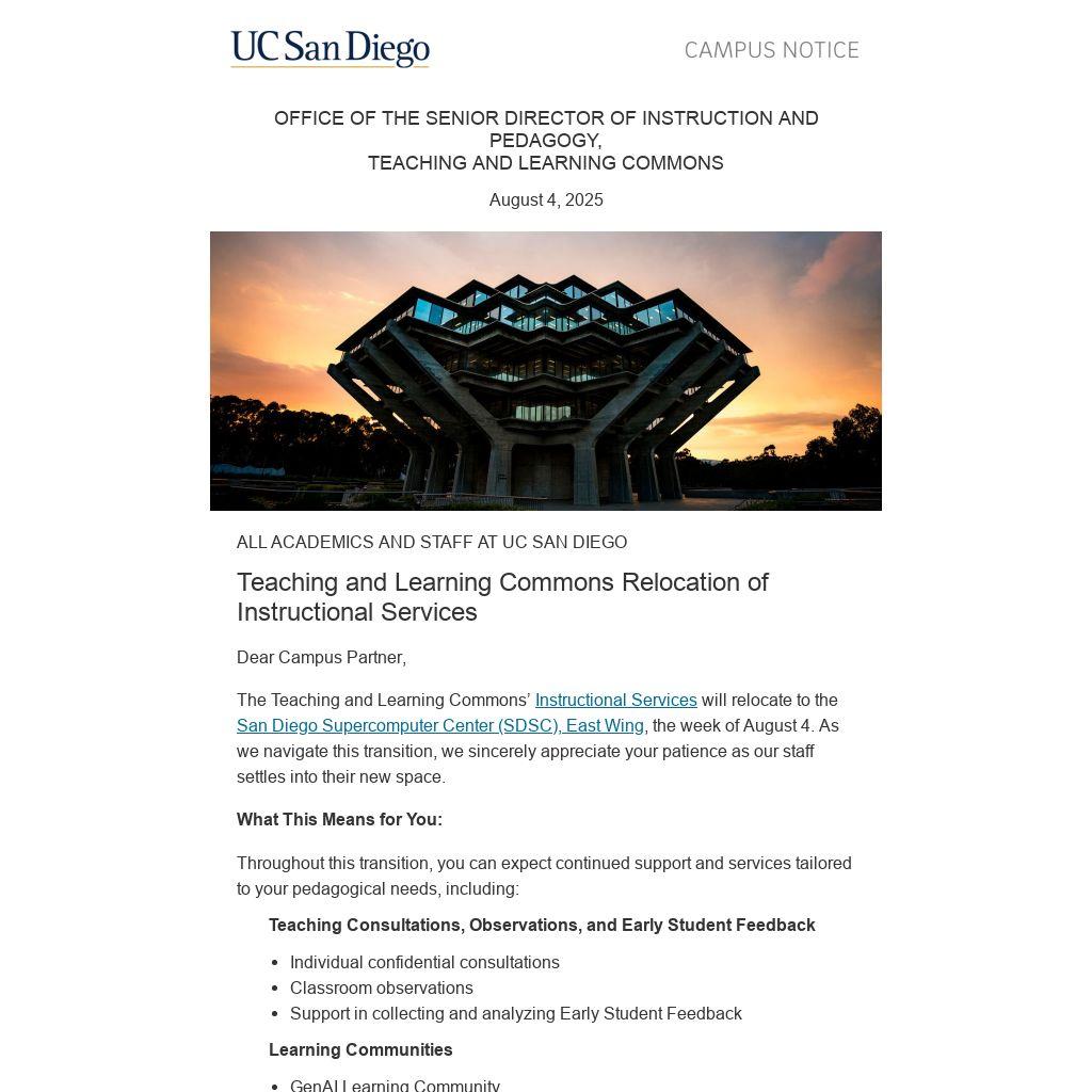 We greatly appreciate your partnership during this relocation as we work to maintain high-quality support for the UC San Diego teaching and learning community.