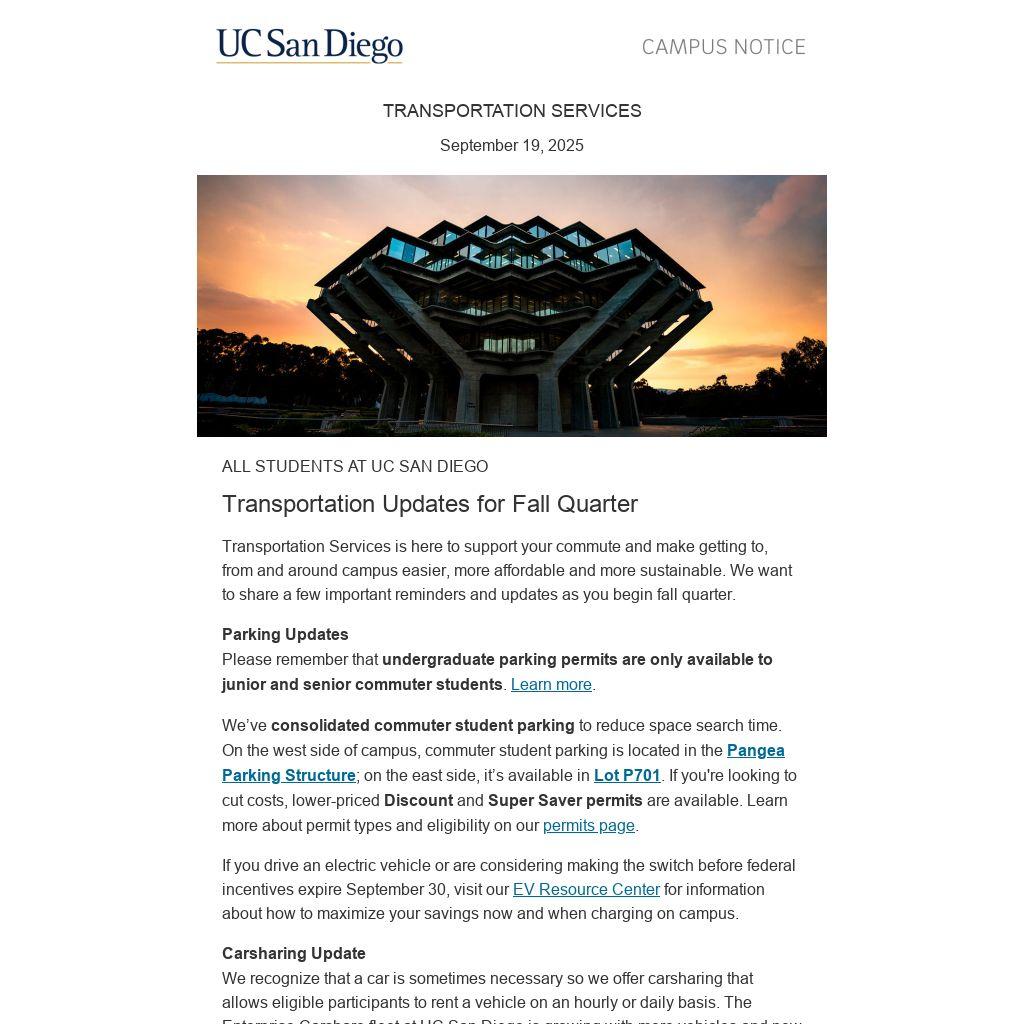 Transportation Services is here to support your commute and make getting to, from and around campus easier, more affordable and more sustainable. We want to share a few important reminders and updates as you begin fall quarter.