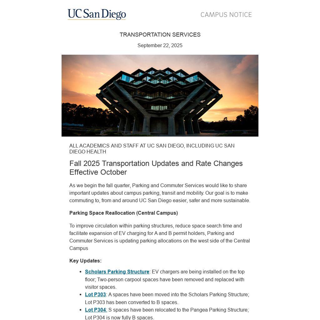 We appreciate your support as we continue to expand sustainable transportation options and balance parking access across campus. Thank you for your partnership in keeping UC San Diego moving forward.