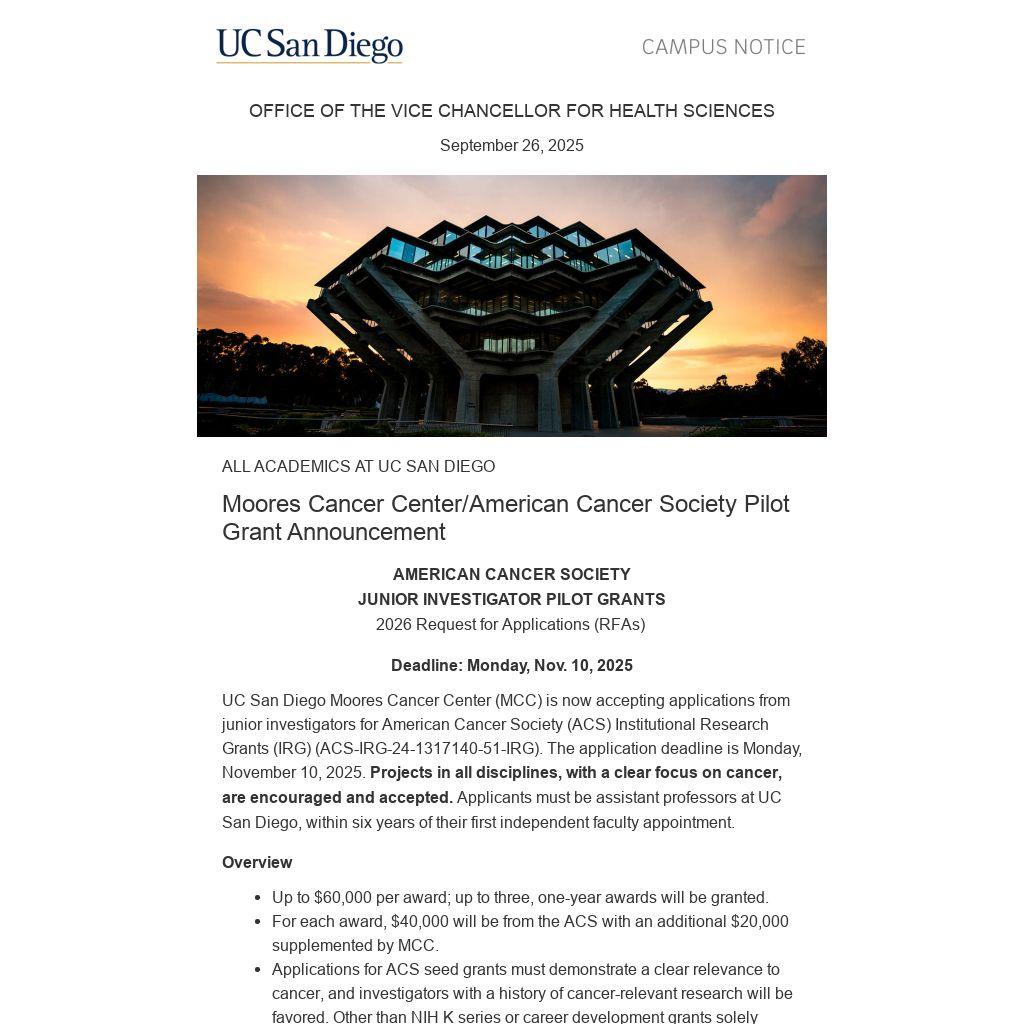 UC San Diego Moores Cancer Center (MCC) is now accepting applications from junior investigators for American Cancer Society (ACS) Institutional Research Grants (IRG) (ACS-IRG-24-1317140-51-IRG). The application deadline is Monday, November 10, 2025. Projects in all disciplines, with a clear focus on cancer, are encouraged and accepted. Applicants must be assistant professors at UC San Diego, within six years of their first independent faculty appointment.