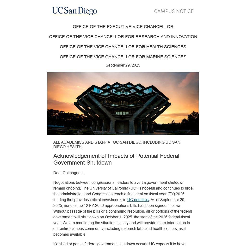 Negotiations between congressional leaders to avert a government shutdown remain ongoing. The University of California (UC) is hopeful and continues to urge the administration and Congress to reach a final deal on fiscal year (FY) 2026 funding that provides critical investments in UC priorities. As of September 29, 2025, none of the 12 FY 2026 appropriations bills has been signed into law. Without passage of the bills or a continuing resolution, all or portions of the federal government will shut down on October 1, 2025, the start of the 2026 federal fiscal year. We are monitoring the situation closely and will provide more information to our entire campus community, including research labs and health centers, as it becomes available.