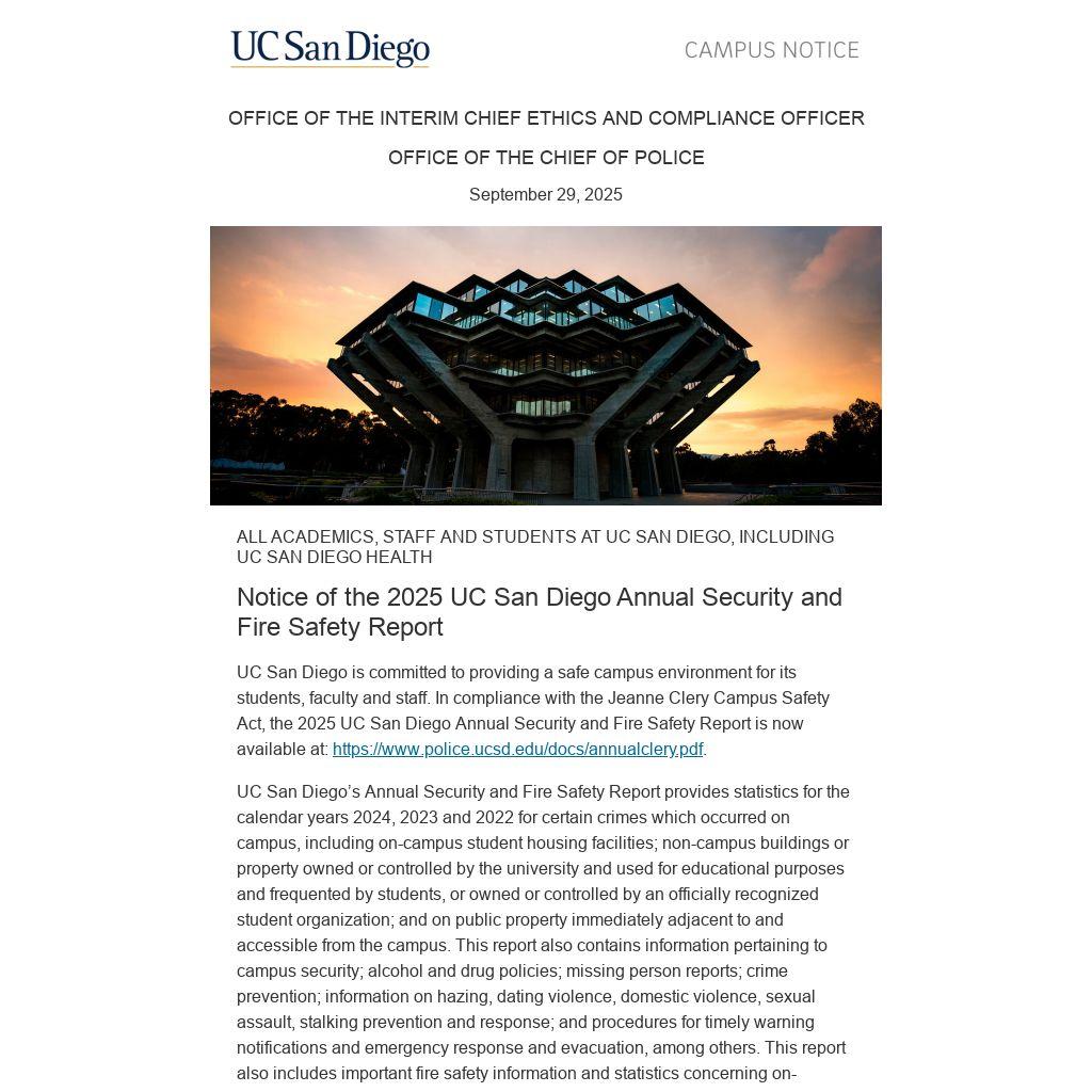 UC San Diego is committed to providing a safe campus environment for its students, faculty and staff. In compliance with the Jeanne Clery Campus Safety Act, the 2025 UC San Diego Annual Security and Fire Safety Report is now available at: https://www.police.ucsd.edu/docs/annualclery.pdf.