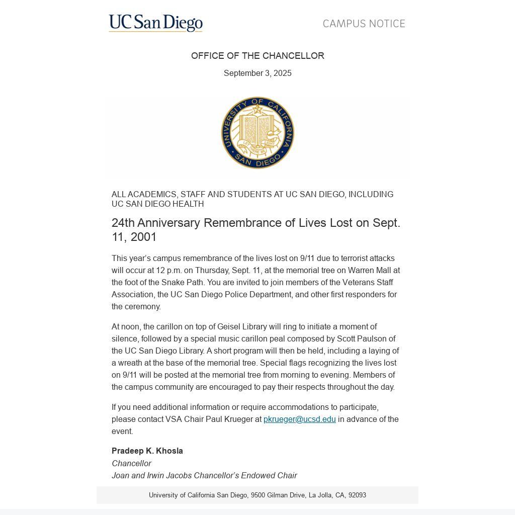 This year’s campus remembrance of the lives lost on 9/11 due to terrorist attacks will occur at 12 p.m. on Thursday, Sept. 11, at the memorial tree on Warren Mall at the foot of the Snake Path. You are invited to join members of the Veterans Staff Association, the UC San Diego Police Department, and other first responders for the ceremony.