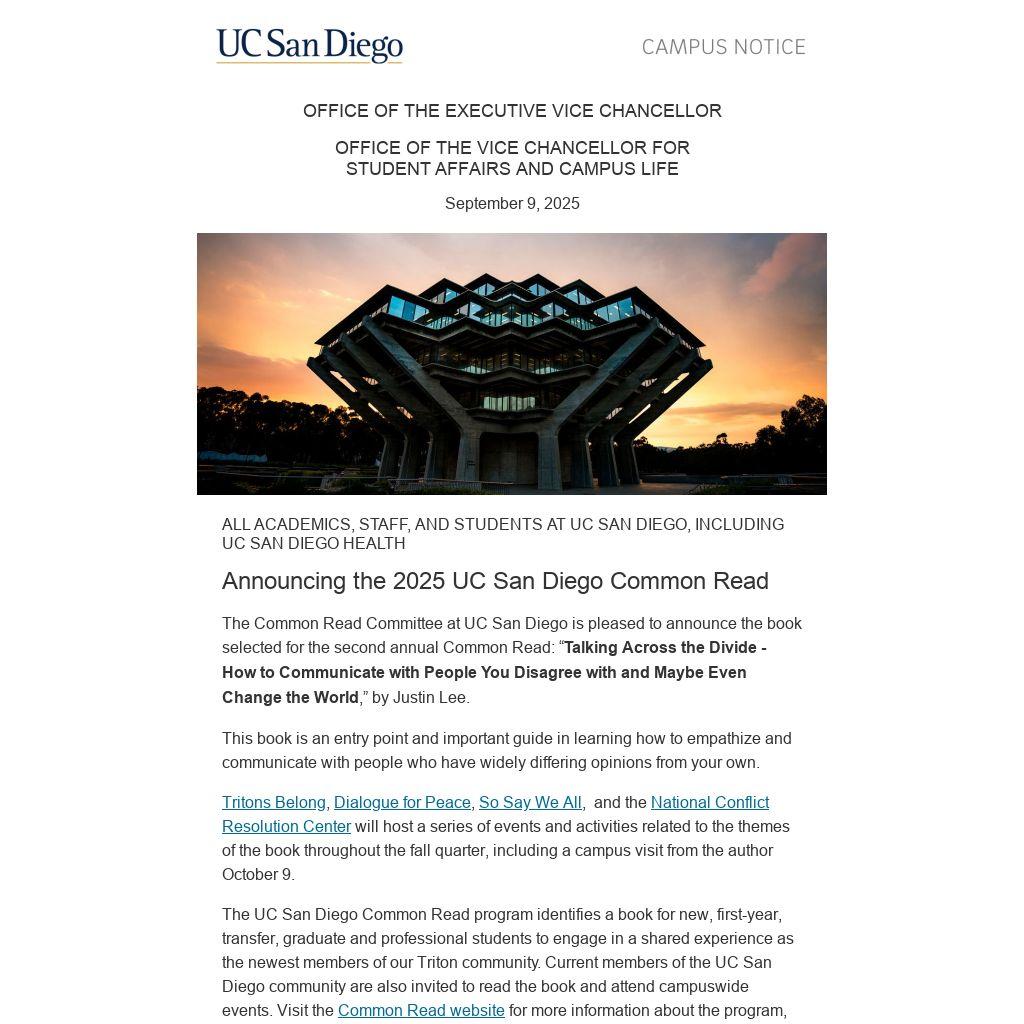 The Common Read Committee at UC San Diego is pleased to announce the book selected for the second annual Common Read: “Talking Across the Divide - How to Communicate with People You Disagree with and Maybe Even Change the World,” by Justin Lee.