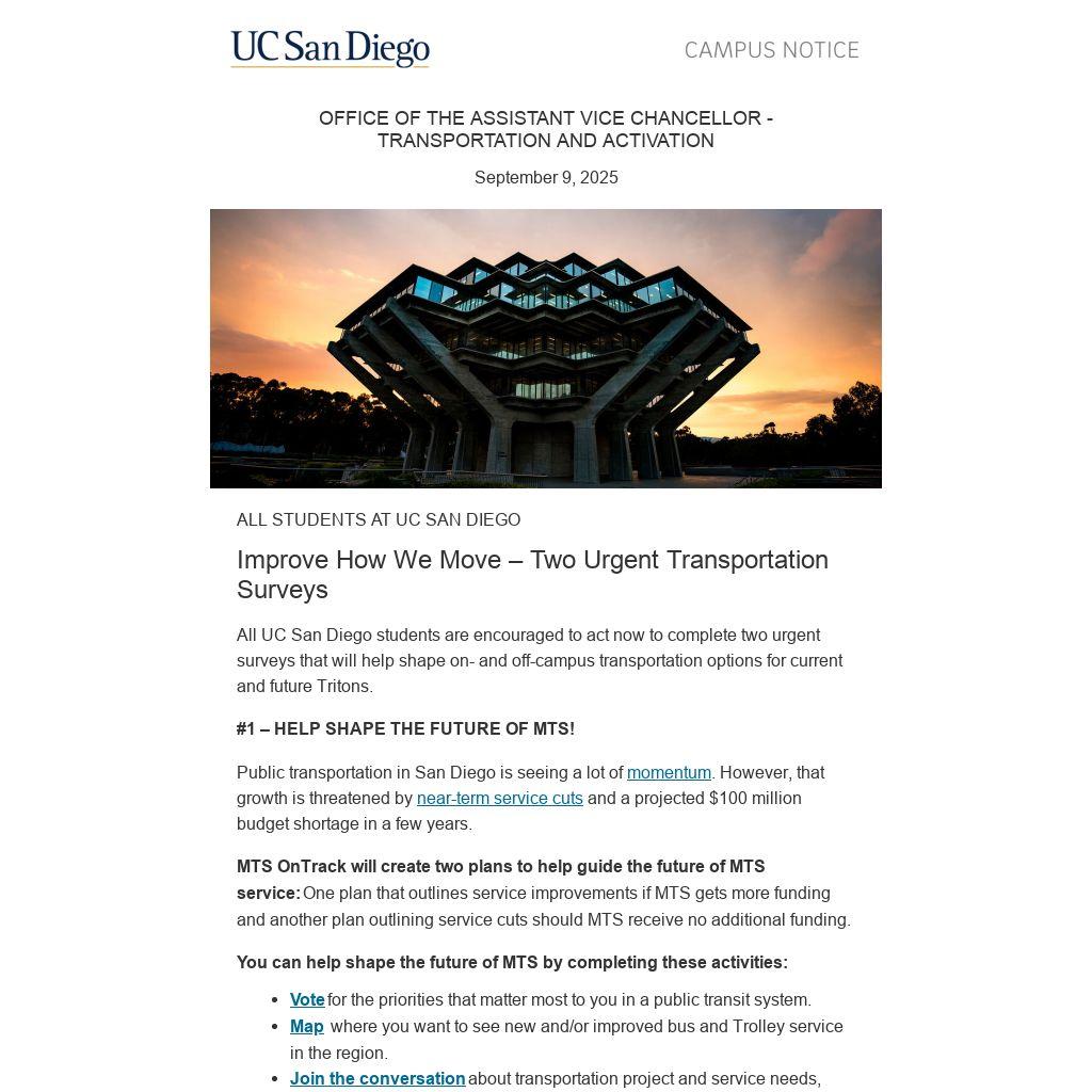 STAC is gathering student input to guide these investments and identify transportation solutions that meet the needs of the UC San Diego community. Your ideas, no matter how big or small, can help shape the future of transportation on campus. Be creative and feel free to suggest programs, services or initiatives you’d like to see. Take the survey by October 17.