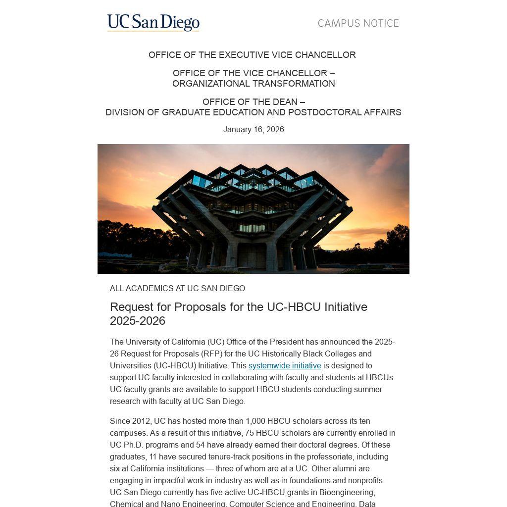 The University of California (UC) Office of the President has announced the 2025-26 Request for Proposals (RFP) for the UC Historically Black Colleges and Universities (UC-HBCU) Initiative. This systemwide initiative is designed to support UC faculty interested in collaborating with faculty and students at HBCUs. UC faculty grants are available to support HBCU students conducting summer research with faculty at UC San Diego.
