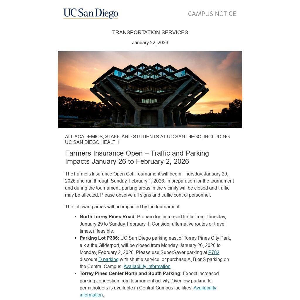 Parking Lot P386: UC San Diego parking east of Torrey Pines City Park, a.k.a the Gliderport, will be closed from Monday, January 26, 2026 to Monday, February 2, 2026. Please use SuperSaver parking at P782, discount D parking with shuttle service, or purchase A, B or S parking on the Central Campus. Availability information.
