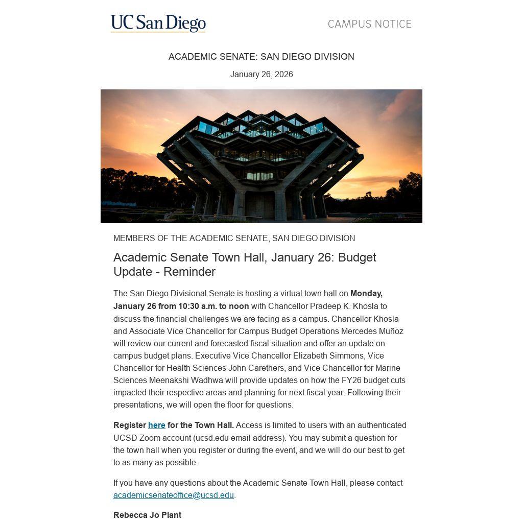 The San Diego Divisional Senate is hosting a virtual town hall on Monday, January 26 from 10:30 a.m. to noon with Chancellor Pradeep K. Khosla to discuss the financial challenges we are facing as a campus. Chancellor Khosla and Associate Vice Chancellor for Campus Budget Operations Mercedes Muñoz will review our current and forecasted fiscal situation and offer an update on campus budget plans. Executive Vice Chancellor Elizabeth Simmons, Vice Chancellor for Health Sciences John Carethers, and Vice Chancellor for Marine Sciences Meenakshi Wadhwa will provide updates on how the FY26 budget cuts impacted their respective areas and planning for next fiscal year. Following their presentations, we will open the floor for questions.