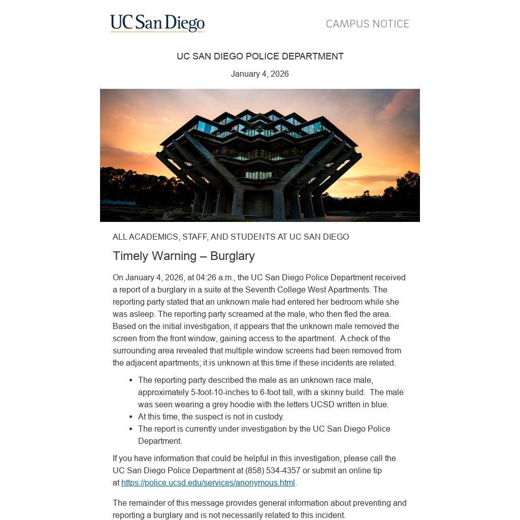 On January 4, 2026, at 04:26 a.m., the UC San Diego Police Department received a report of a burglary in a suite at the Seventh College West Apartments. The reporting party stated that an unknown male had entered her bedroom while she was asleep. The reporting party screamed at the male, who then fled the area. Based on the initial investigation, it appears that the unknown male removed the screen from the front window, gaining access to the apartment. A check of the surrounding area revealed that multiple window screens had been removed from the adjacent apartments; it is unknown at this time if these incidents are related.