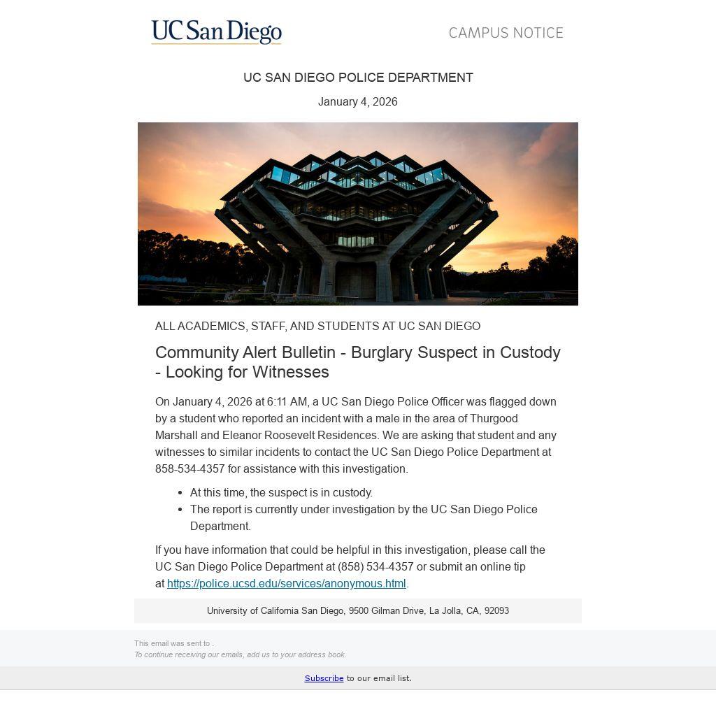 On January 4, 2026 at 6:11 AM, a UC San Diego Police Officer was flagged down by a student who reported an incident with a male in the area of Thurgood Marshall and Eleanor Roosevelt Residences. We are asking that student and any witnesses to similar incidents to contact the UC San Diego Police Department at 858-534-4357 for assistance with this investigation.