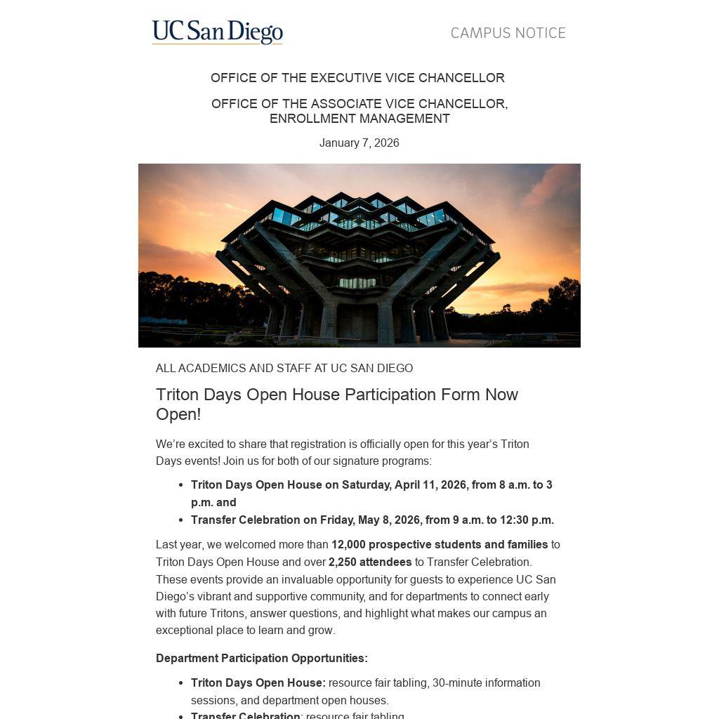 - Triton Days Open House: resource fair tabling, 30-minute information sessions, and department open houses.