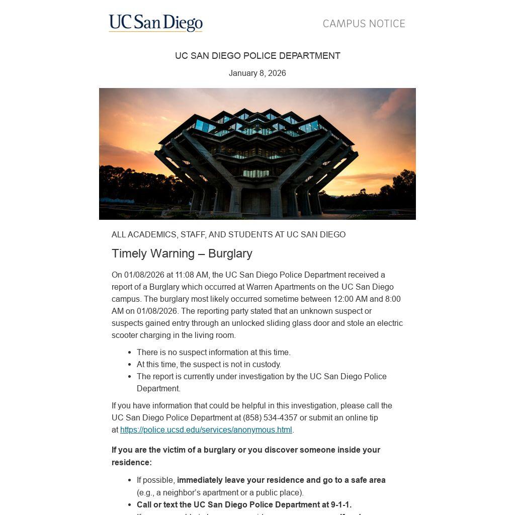 On 01/08/2026 at 11:08 AM, the UC San Diego Police Department received a report of a Burglary which occurred at Warren Apartments on the UC San Diego campus. The burglary most likely occurred sometime between 12:00 AM and 8:00 AM on 01/08/2026. The reporting party stated that an unknown suspect or suspects gained entry through an unlocked sliding glass door and stole an electric scooter charging in the living room.