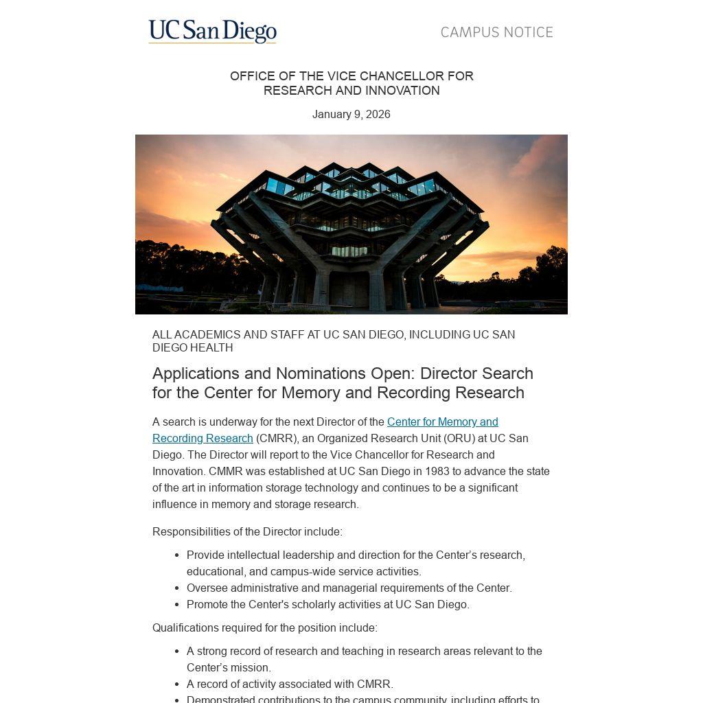 Eligibility is limited to tenured faculty at UC San Diego. The initial appointment is expected to be for a four-year term from July 1, 2026, to June 30, 2030.
