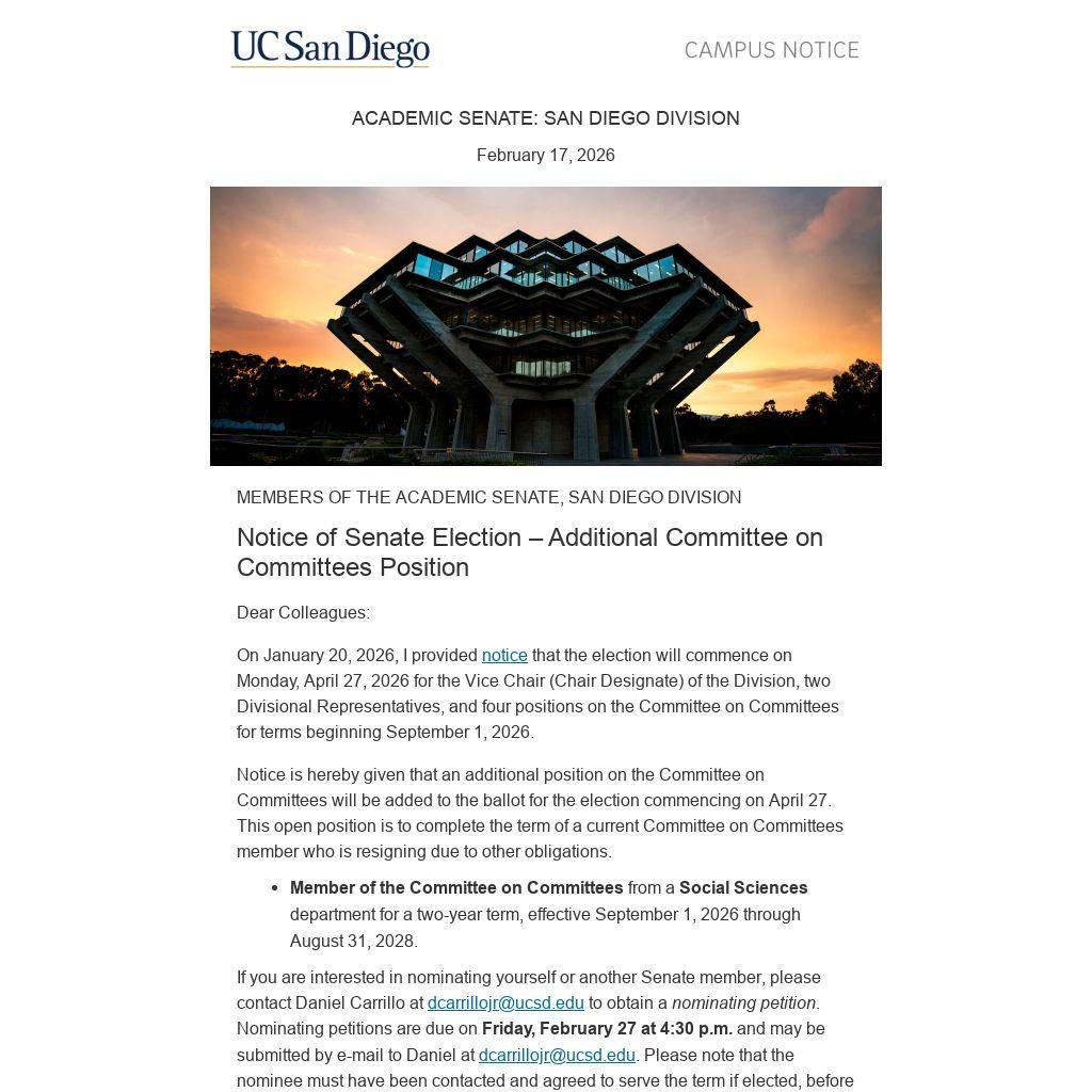 If you are interested in nominating yourself or another Senate member, please contact Daniel Carrillo at dcarrillojr@ucsd.edu to obtain a nominating petition. Nominating petitions are due on Friday, February 27 at 4:30 p.m. and may be submitted by e-mail to Daniel at dcarrillojr@ucsd.edu. Please note that the nominee must have been contacted and agreed to serve the term if elected, before the nomination is submitted.