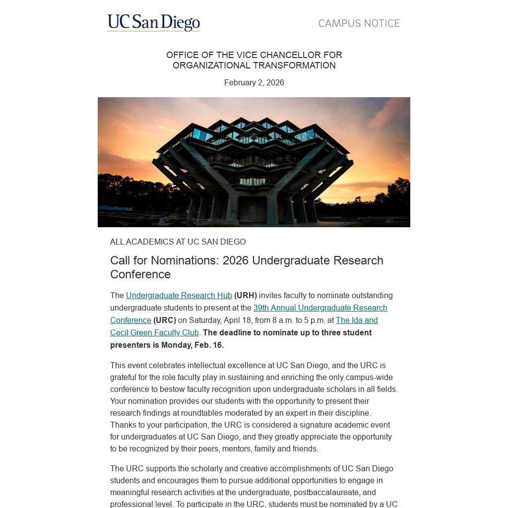 Your participation as a nominator, moderator, and/or attendee at this distinctive and welcoming academic gathering provides vital support to the prestige of undergraduate research at UC San Diego, and we appreciate your encouragement of this valuable program.
