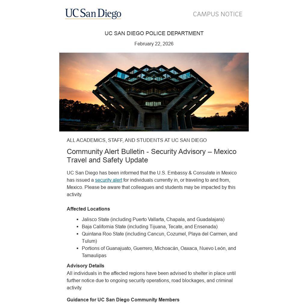UC San Diego has been informed that the U.S. Embassy & Consulate in Mexico has issued a security alert for individuals currently in, or traveling to and from, Mexico. Please be aware that colleagues and students may be impacted by this activity.