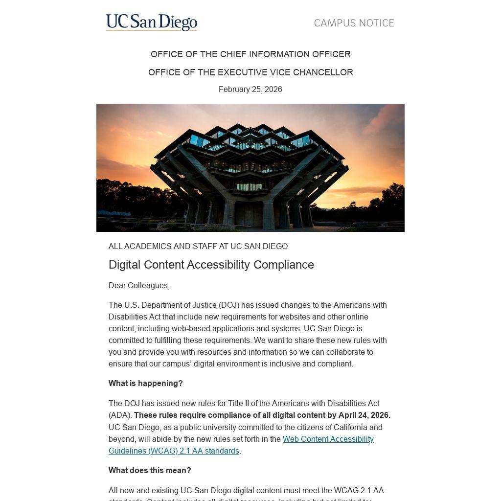 The DOJ has issued new rules for Title II of the Americans with Disabilities Act (ADA). These rules require compliance of all digital content by April 24, 2026. UC San Diego, as a public university committed to the citizens of California and beyond, will abide by the new rules set forth in the Web Content Accessibility Guidelines (WCAG) 2.1 AA standards.