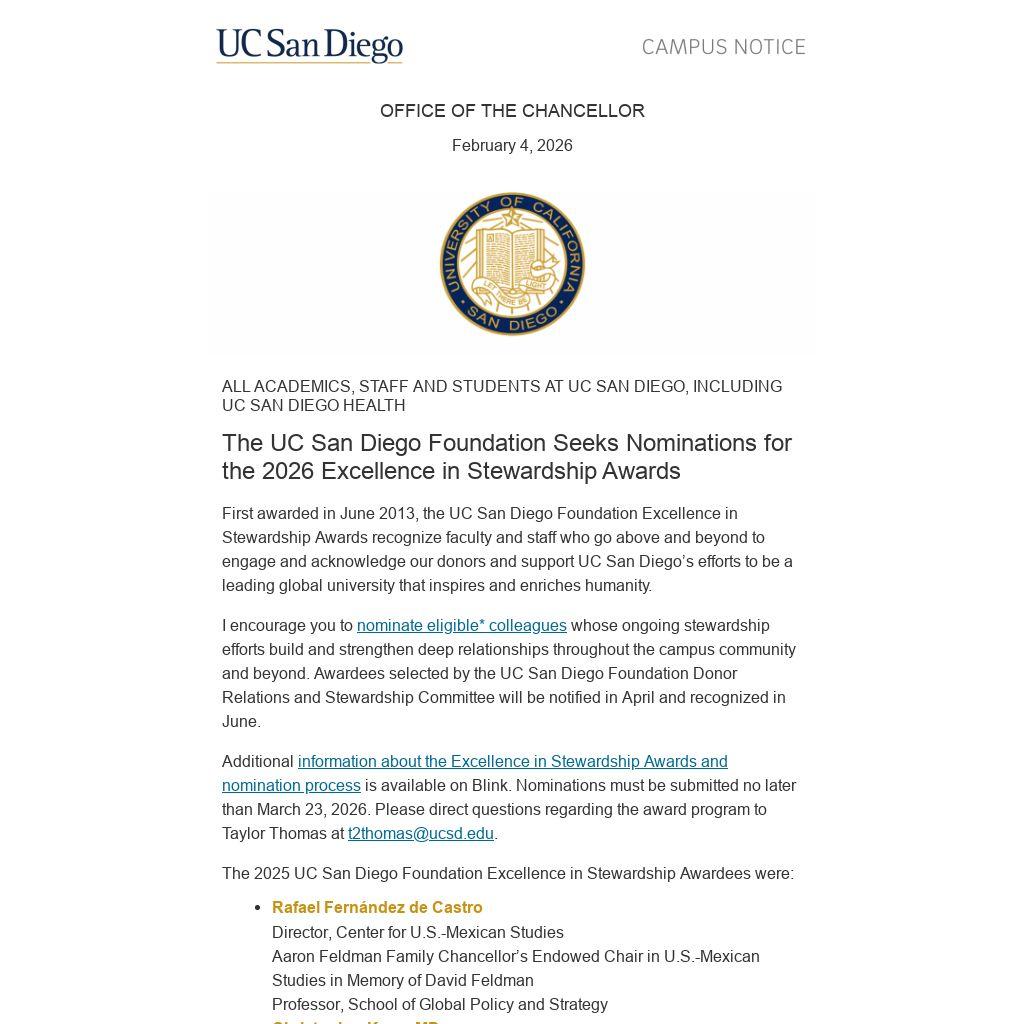 Additional information about the Excellence in Stewardship Awards and nomination process is available on Blink. Nominations must be submitted no later than March 23, 2026. Please direct questions regarding the award program to Taylor Thomas at t2thomas@ucsd.edu.