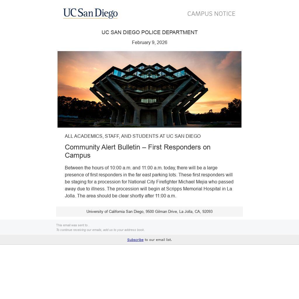 Between the hours of 10:00 a.m. and 11:00 a.m. today, there will be a large presence of first responders in the far east parking lots. These first responders will be staging for a procession for National City Firefighter Michael Mejia who passed away due to illness. The procession will begin at Scripps Memorial Hospital in La Jolla. The area should be clear shortly after 11:00 a.m.