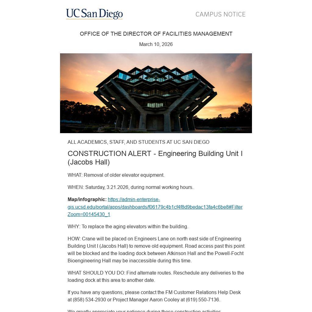 HOW: Crane will be placed on Engineers Lane on north east side of Engineering Building Unit I (Jacobs Hall) to remove old equipment. Road access past this point will be blocked and the loading dock between Atkinson Hall and the Powell-Focht Bioengineering Hall may be inaccessible during this time.
