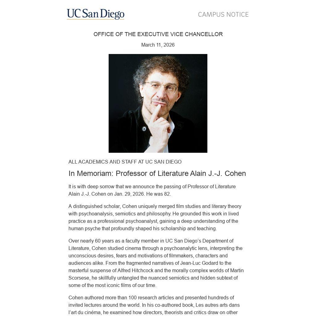 Beyond his scholarship, Cohen helped shape film studies at UC San Diego. He played a key role in sparking the creation of a film studies minor — an important precursor to the university’s recent introduction of a major in cinematic arts and film studies. He taught undergraduate and graduate courses in film studies, semiotics and French literature, earning a reputation for patient mentorship and deeply attentive feedback. Many students returned for multiple courses, drawn to the way he nurtured confidence and made them feel seen and heard.