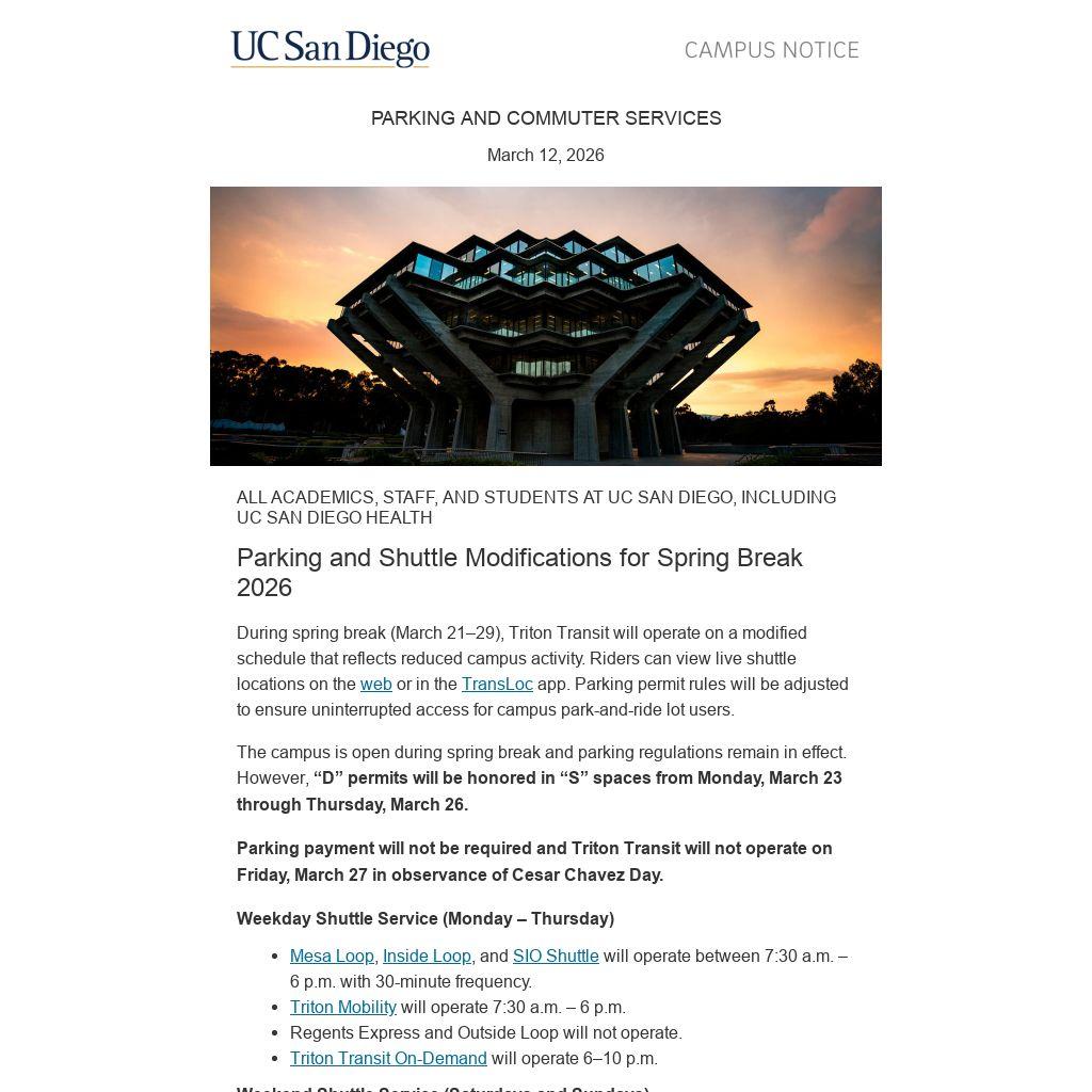 During spring break (March 21–29), Triton Transit will operate on a modified schedule that reflects reduced campus activity. Riders can view live shuttle locations on the web or in the TransLoc app. Parking permit rules will be adjusted to ensure uninterrupted access for campus park-and-ride lot users.