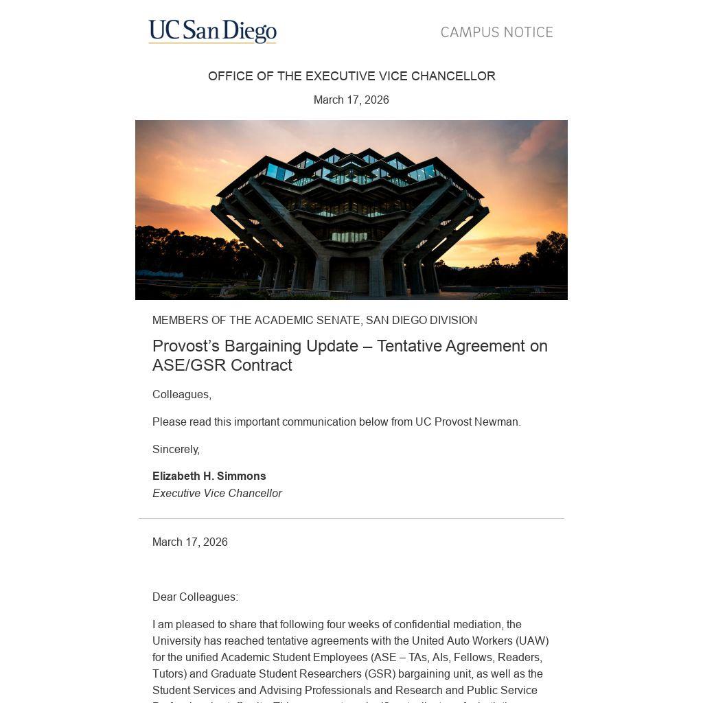 I am pleased to share that following four weeks of confidential mediation, the University has reached tentative agreements with the United Auto Workers (UAW) for the unified Academic Student Employees (ASE – TAs, AIs, Fellows, Readers, Tutors) and Graduate Student Researchers (GSR) bargaining unit, as well as the Student Services and Advising Professionals and Research and Public Service Professionals staff units. This represents a significant milestone for both the University and the UAW, and as a result, UAW has called off the strike that was previously authorized. These tentative agreements will now be put before the union membership for ratification which we believe will occur by the end of this week.