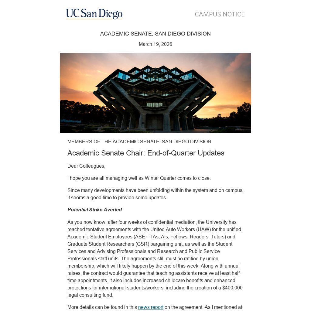 As you now know, after four weeks of confidential mediation, the University has reached tentative agreements with the United Auto Workers (UAW) for the unified Academic Student Employees (ASE – TAs, AIs, Fellows, Readers, Tutors) and Graduate Student Researchers (GSR) bargaining unit, as well as the Student Services and Advising Professionals and Research and Public Service Professionals staff units. The agreements still must be ratified by union membership, which will likely happen by the end of this week. Along with annual raises, the contract would guarantee that teaching assistants receive at least half-time appointments. It also includes increased childcare benefits and enhanced protections for international students/workers, including the creation of a $400,000 legal consulting fund.