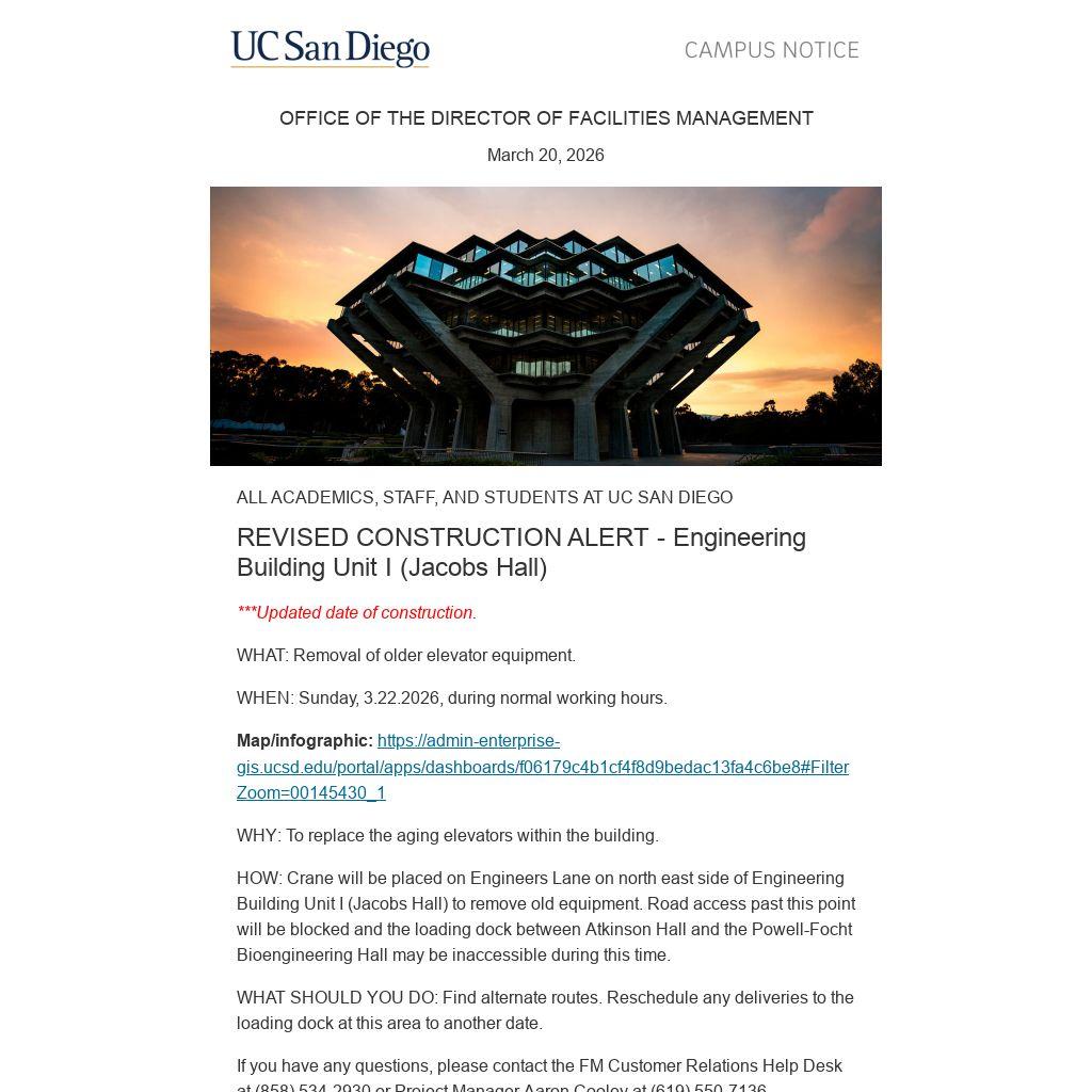 HOW: Crane will be placed on Engineers Lane on north east side of Engineering Building Unit I (Jacobs Hall) to remove old equipment. Road access past this point will be blocked and the loading dock between Atkinson Hall and the Powell-Focht Bioengineering Hall may be inaccessible during this time.