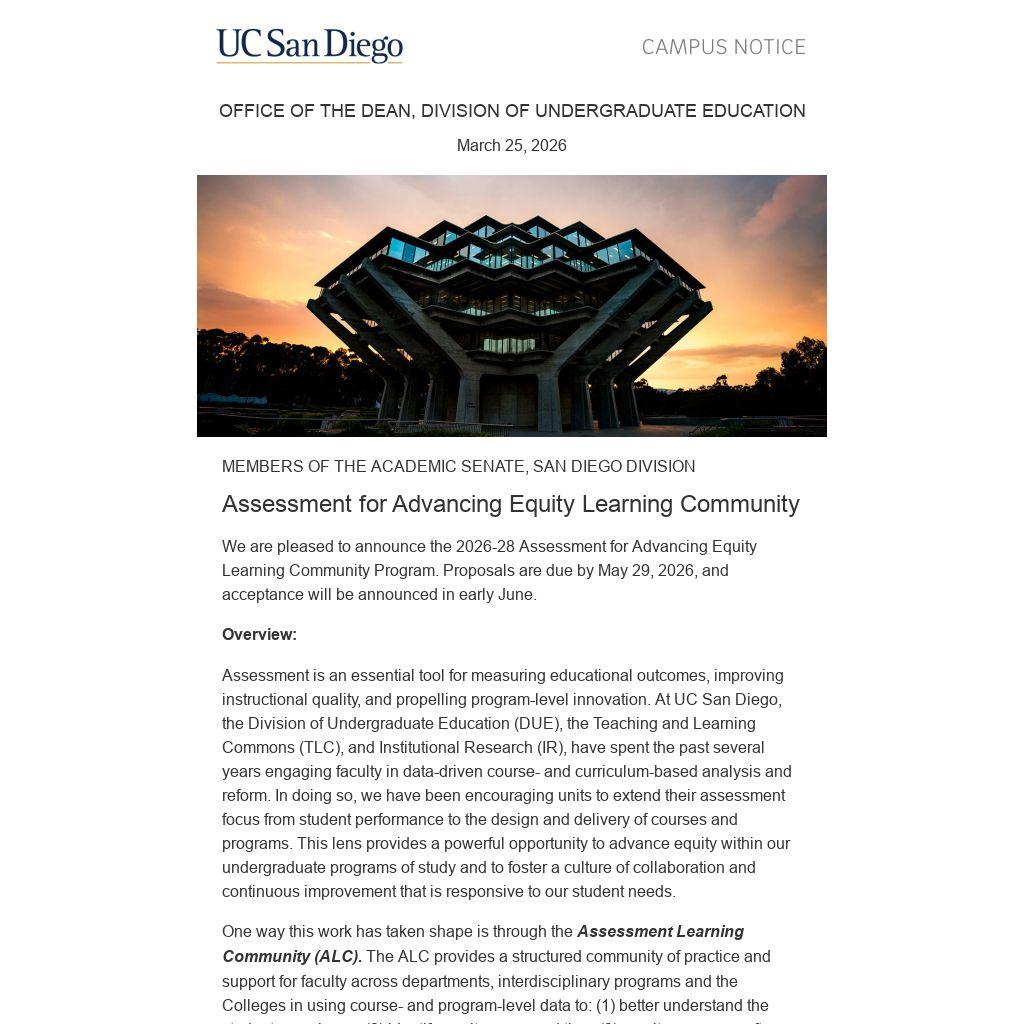 Assessment is an essential tool for measuring educational outcomes, improving instructional quality, and propelling program-level innovation. At UC San Diego, the Division of Undergraduate Education (DUE), the Teaching and Learning Commons (TLC), and Institutional Research (IR), have spent the past several years engaging faculty in data-driven course- and curriculum-based analysis and reform. In doing so, we have been encouraging units to extend their assessment focus from student performance to the design and delivery of courses and programs. This lens provides a powerful opportunity to advance equity within our undergraduate programs of study and to foster a culture of collaboration and continuous improvement that is responsive to our student needs.