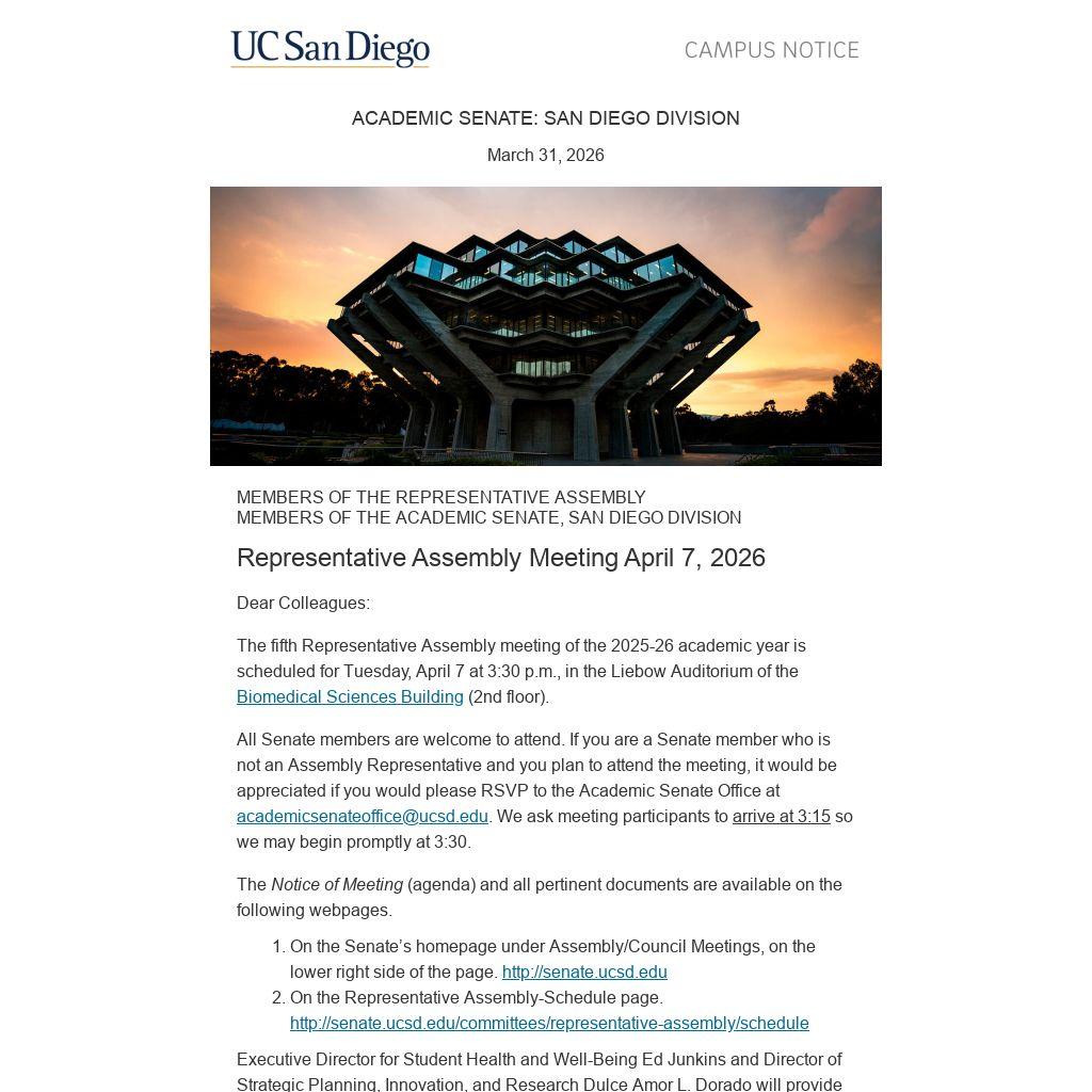 All Senate members are welcome to attend. If you are a Senate member who is not an Assembly Representative and you plan to attend the meeting, it would be appreciated if you would please RSVP to the Academic Senate Office at academicsenateoffice@ucsd.edu. We ask meeting participants to arrive at 3:15 so we may begin promptly at 3:30.