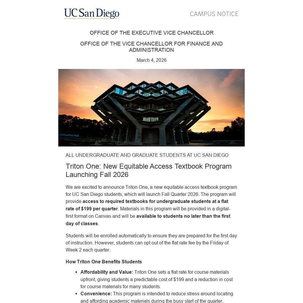 We are excited to announce Triton One, a new equitable access textbook program for UC San Diego students, which will launch Fall Quarter 2026. The program will provide access to required textbooks for undergraduate students at a flat rate of $199 per quarter. Materials in this program will be provided in a digital-first format on Canvas and will be available to students no later than the first day of classes.