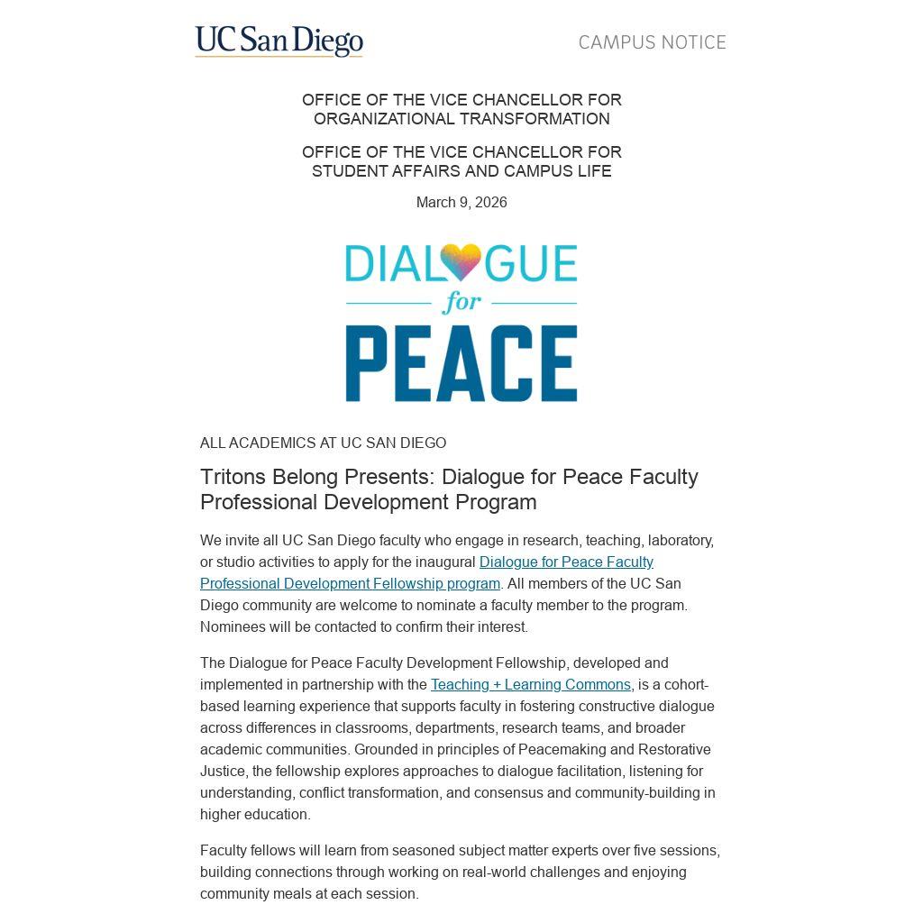 We invite all UC San Diego faculty who engage in research, teaching, laboratory, or studio activities to apply for the inaugural Dialogue for Peace Faculty Professional Development Fellowship program. All members of the UC San Diego community are welcome to nominate a faculty member to the program. Nominees will be contacted to confirm their interest.