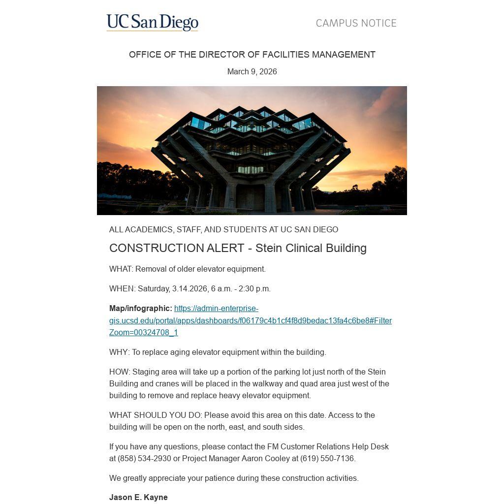 HOW: Staging area will take up a portion of the parking lot just north of the Stein Building and cranes will be placed in the walkway and quad area just west of the building to remove and replace heavy elevator equipment.