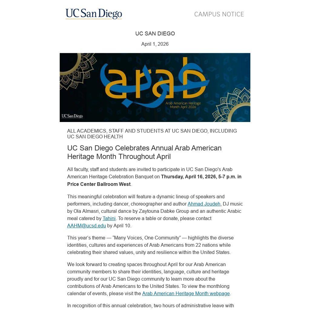 All faculty, staff and students are invited to participate in UC San Diego's Arab American Heritage Celebration Banquet on Thursday, April 16, 2026, 5-7 p.m. in Price Center Ballroom West.